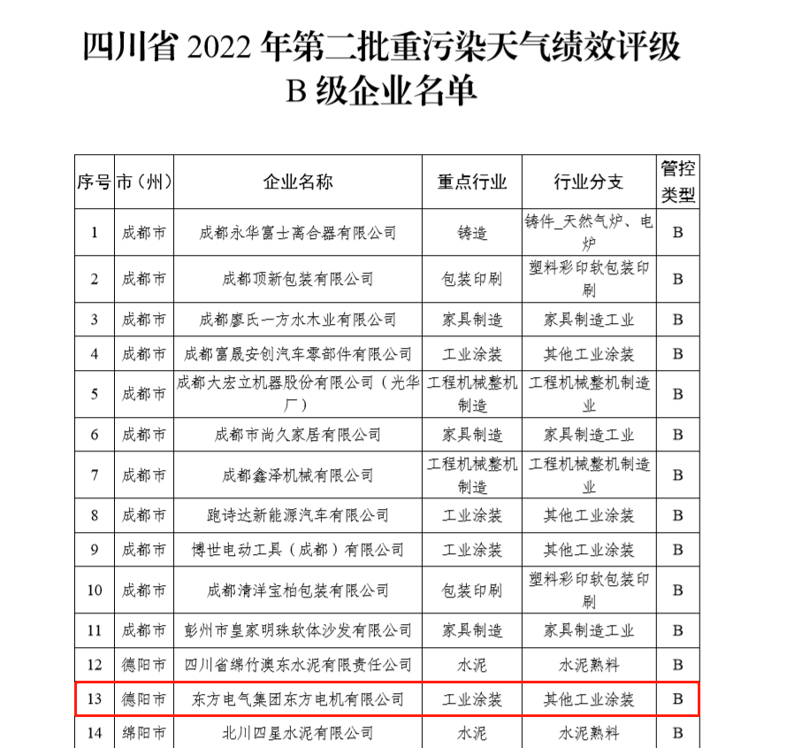 6月14日,四川省生态环境厅发布《2022年四川省第二批重污染天气重点行业企业绩效评级结果的公告》,壹号娱乐-com - NG大舞台,有梦你就来电机正式获得四川省重污染天气绩效B级企业认定,开启推动绿色低碳发展新篇章。