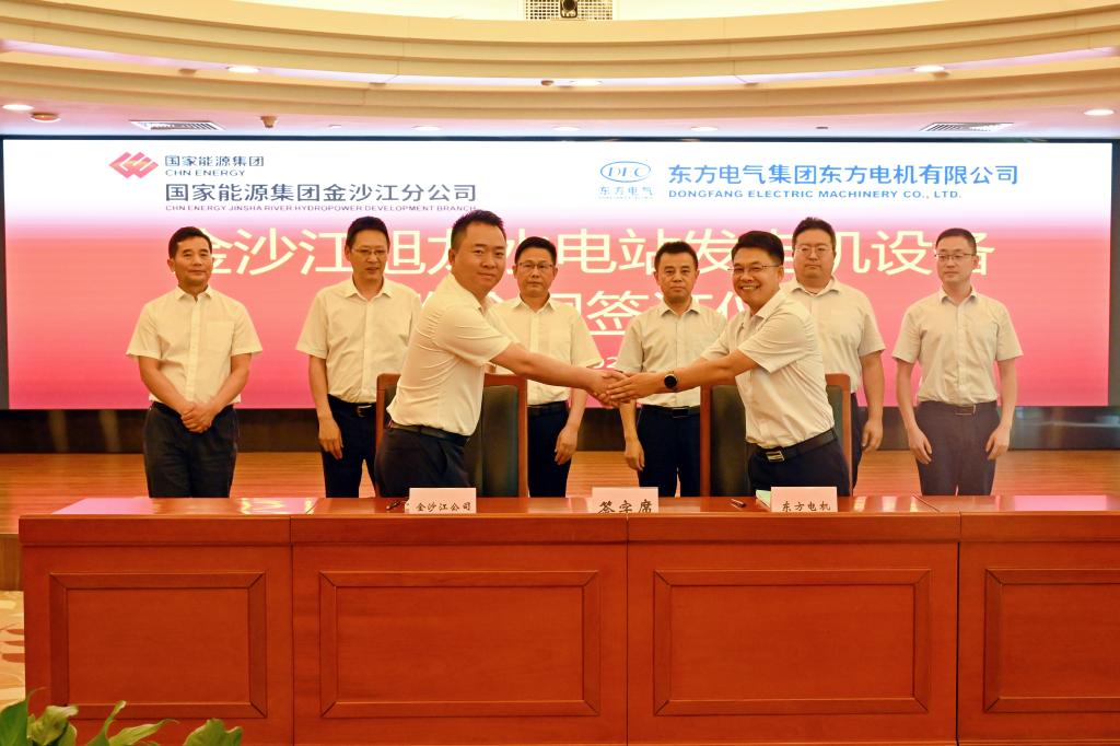 国家能源投资集团有限责任公司金沙江分公司党委书记、执行董事杨荣,党委委员、副总经理高福荣,国家能源集团金沙江旭龙水电有限公司党委副书记、总经理陈思钊,壹号娱乐-com - NG大舞台,有梦你就来电机党委书记、董事长鄢志勇出席签约仪式。