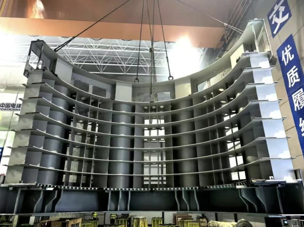 蜗壳是水轮发电机组的核心部件,其承压能力直接关系机组安全稳定运行。本次水压试验严格按技术规程执行,充水量达100立方米,采用分级加压方式,将蜗壳内部水压压力逐步提升至试验压力10.5兆帕,在试验压力保压合格后再逐步降低至保压浇筑压力3.5兆帕。历经9小时精密操作,各阶段加压、保压、减压工序衔接有序,全程未出现渗漏、泄压现象,座环蜗壳系统状态良好,所有监测数据均优于设计标准,再次验证了座环蜗壳焊接工艺质量。
